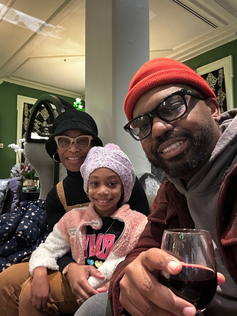 By New Year’s Eve, the family was back, and we decided to end the year on a high note. We checked into the Kimpton Hotel Monaco in downtown D.C., near Capital One Arena, for a little staycation to ring in 2025. The hotel was beautifully decked out in holiday décor, and we learned it used to be an old post office building—super cool history! The spacious hallways and cozy room were perfect for us to unwind and reset.